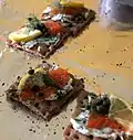 Obložené chlebíčky Czech Republic, Slovakia A Czech and Slovak appetizer or snack, it consists of an open-faced sandwich topped with butter and a variety of other toppings, such as cured meats, fish, hard-boiled egg, and vegetables.