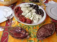 Picada Argentina A serving of savory snack and finger foods, including cheeses, cured meats, fermented sausages, olives and peanuts.[27][28]
