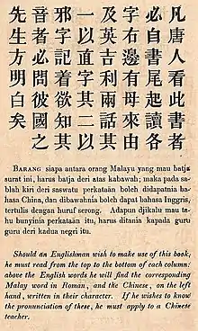1839 – Trilingual Chinese-Malay-English text – Malay was the lingua franca across the Strait of Malacca, including the coasts of the Malay Peninsula of Malaysia and the eastern coast of Sumatra in Indonesia.