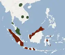 Previously seen in dipterocarp forests with grasslands. No confirmations since 1970; possibly extinct. | CR, possibly EX