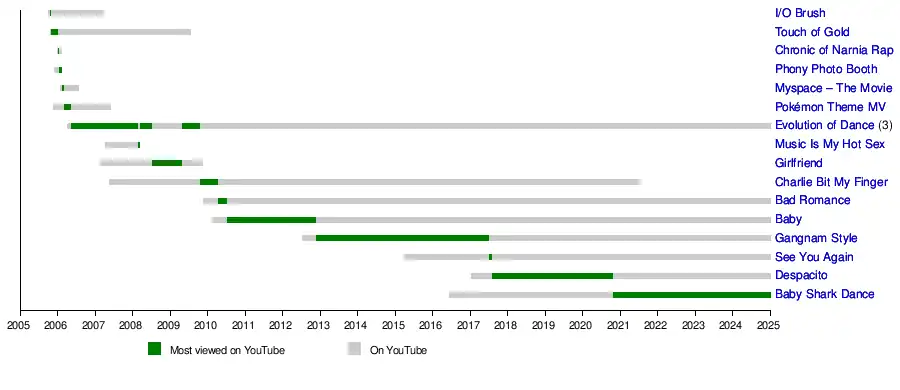 The following table lists the videos that became YouTube's most-viewed video, from October 2005 to the present.