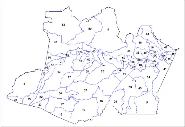 This is a list of the municipalities in the state of Amazonas (AM), located in the North Region of Brazil. Amazonas is divided into 62 municipalities, which are grouped into 13 microregions, which are grouped into 4 mesoregions.