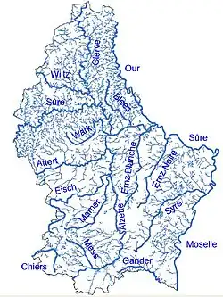All of Luxembourg's rivers are drained into the North Sea, most via the river Moselle, except in the extreme south-west of the country, which are drained by the Chiers. Rivers that flow into the sea are sorted alphabetically. Rivers that flow into other rivers are sorted by the proximity of their points of confluence to the sea. Some rivers (e.g. Meuse, Rhine) do not flow through Luxembourg themselves, but they are mentioned for having tributaries from Luxembourg. They are given in italics. For an alphabetical list of rivers of Luxembourg see Category:Rivers of Luxembourg.