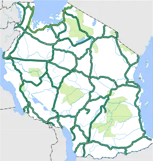 The following is a list of national roads in Tanzania, under the jurisdiction of the Tanzania National Roads Agency (TANROADS). The list is not exhaustive. As part of the 2007 Roads Act in Tanzania, National roads were classified into two categories, Trunk Roads and Regional Roads. The total road network in Tanzania as of December 2022 is 181,190 km (112,590 mi), of which 36,760 km (22,840 mi) are classified as National Roads (Trunk &; Regional) and 144,429 km (89,744 mi) as District Roads (Collector, Feeder and Urban roads). District roads are under the responsibility of the President’s Office Regional Administration and Local Government (PORALG) through Tanzania Rural and Urban Roads Agency (TARURA).[1][2] Before 1980, Tanzania shared the same highway numbering system as Kenya, following the dissolution of the East African Community, the country renamed its roads to the A and B numbering system still available on some out dated maps.[3]