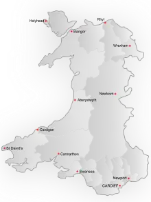 Bagillt, Bala, Bangor, Bargoed, Barmouth, Barry, Beaumaris, Bedwas, Bethesda, Blaenau Ffestiniog, Blaenavon, Blackwood, Blaina, Brecon, Bridgend, Briton Ferry, Brynmawr, Buckley, Builth Wells, Burry Port