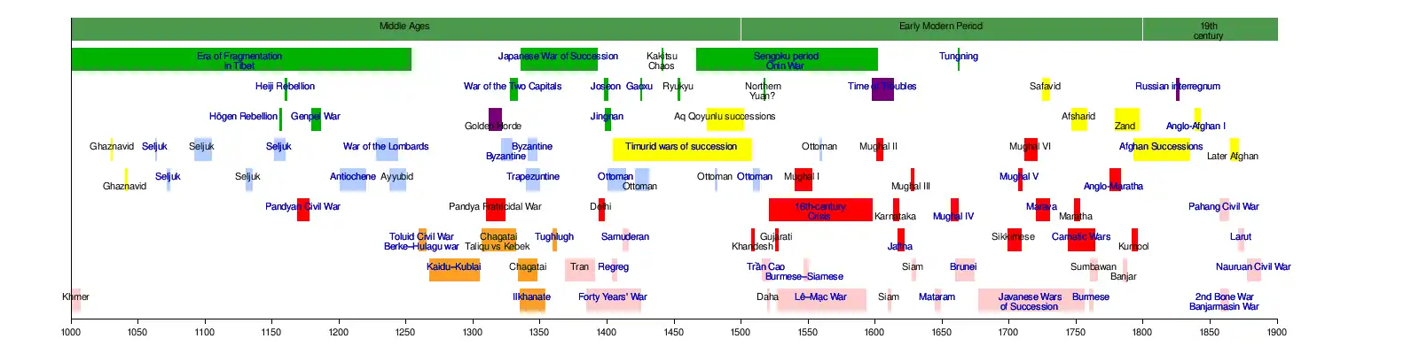 Banjarmasin WarSecond Bone WarJavanese Wars of SuccessionJavanese Wars of Succession Forty Years' WarNauruan Civil WarBrunei Civil WarBurmese–Siamese War (1547–1549)Trần Cao rebellionRegreg WarKaidu–Kublai warLarut WarsCarnatic WarsTughlugh TimurBerke–Hulagu warToluid Civil WarPahang Civil WarMarava War of SuccessionCrisis of the Sixteenth CenturyCrisis of the Sixteenth CenturyAnglo-Maratha WarsMughal war of succession (1707–1709)Ottoman Civil War (1509–13)Ottoman InterregnumWar of the Antiochene SuccessionTimurid wars of successionByzantine civil war of 1321–1328Byzantine civil war of 1341–1347War of the LombardsMuhammad II ibn MahmudFirst Anglo-Afghan WarJingnan campaignGenpei WarHōgen RebellionRussian interregnum of 1825Time of TroublesGaoxu rebellionWar of the Two CapitalsHeiji RebellionKingdom of TungningŌnin WarSengoku periodNanboku-chō periodEra of FragmentationEra of Fragmentation