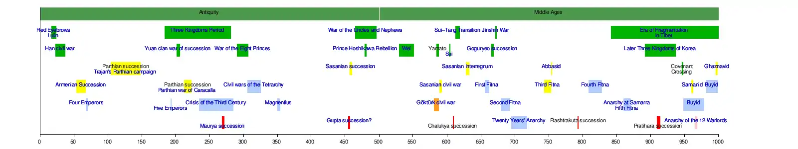 Anarchy of the 12 WarlordsTwenty Years' AnarchySkandaguptaAshokaAbbasid civil war (865–866)Anarchy at SamarraSecond FitnaGöktürk civil warRoman civil war of 350–353Crisis of the Third CenturyYear of the Five EmperorsYear of the Four EmperorsFourth FitnaThird FitnaFirst FitnaSasanian civil war of 589-591Civil wars of the TetrarchyParthian war of CaracallaWar of the Armenian SuccessionBattle of Ghazni (998)Sasanian civil war of 628–632Trajan's Parthian campaignLater Three Kingdoms of KoreaGoguryeo–Tang WarPrince Hoshikawa RebellionWar of the Eight PrincesEra of FragmentationEra of FragmentationJinshin WarTransition from Sui to TangThree Kingdoms PeriodLulinRed Eyebrows