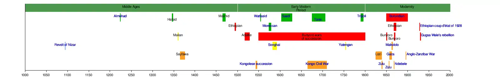 LobengulaBattle of NdondakusukaKongo Civil WarPedro I of KongoAnglo-Zanzibar WarGaza EmpireNaaba KangoRevolt of NizarGugsa Wale's rebellionEthiopian coup d'état of 1928Abu Marwan Abd al-Malik I SaadiMwezi IV of BurundiTripolitanian civil warRevolutions of TunisBattle of Tadla