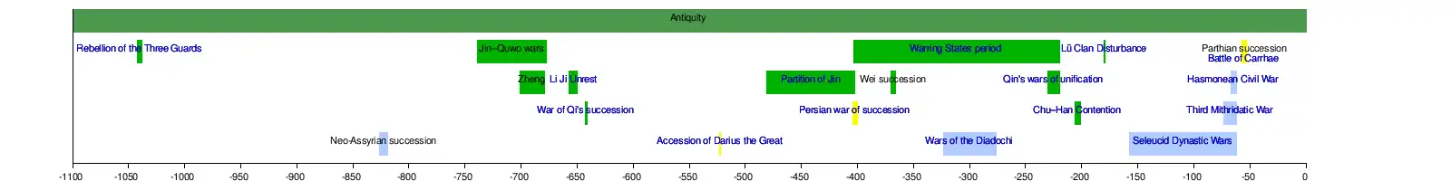Seleucid Dynastic WarsWars of the DiadochiThird Mithridatic WarChu–Han ContentionBattle of CunaxaWar of Qi's successionHasmonean Civil WarQin's wars of unificationPartition of JinLi Ji UnrestBattle of CarrhaeLü Clan DisturbanceWarring States periodRebellion of the Three Guards