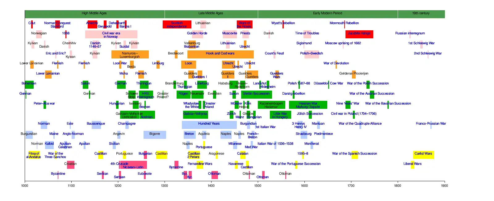 Ottoman Civil War (1509–13)Ottoman InterregnumByzantine civil war of 1352–1357Byzantine civil war of 1341–1347War of the Euboeote SuccessionBattle of PantinaLiberal WarsWar of the Portuguese SuccessionWar of the Castilian SuccessionNavarrese Civil War (1451–1455)Fernandine WarsByzantine civil war of 1321–1328Nicaean–Latin warsFourth CrusadeCarlist WarsWar of the Spanish SuccessionFranco-Spanish War (1595–98)Catalan Civil WarWar of the Two PetersCastilian Civil WarWar of the Three SanchosWar of the Three SanchosFitna of al-AndalusFitna of al-AndalusWar of the Montferrat SuccessionItalian War of 1536–1538Mad WarMilanese War of Succession1383–1385 Portuguese interregnumKalbidsPiedmontese Civil WarStrasbourg Bishops' WarFrench–Breton WarFrench–Breton WarWar of the Breton SuccessionBattle of TinchebrayFranco-Prussian WarWar of the Quadruple AllianceWar of the Mantuan SuccessionSuccession of Henry IV of FranceWar of the Three HenrysItalian War of 1494–1495War of the Burgundian SuccessionHundred Years' WarWar of the Succession of ChampagneBaussenque WarsFulco I, Margrave of MilanCivil war in Poland (1704–1706)War of the Jülich SuccessionHabsburg–Ottoman wars in Hungary (1526–1568)Habsburg–Ottoman wars in Hungary (1526–1568)War of the Hungarian SuccessionMainz Diocesan FeudOld Zürich WarGalicia–Volhynia WarsBattle of KressenbrunnWar of the Bavarian SuccessionNine Years' WarHessian WarCologne Diocesan Feud Civil war in Greater Poland (1382–1385)Civil war in Greater Poland (1382–1385)Władysław the White's rebellionWładysław the White's rebellionBremen Diocesan FeudWar of the Austrian SuccessionDanzig rebellionWar of the Succession of StettinSaxon Fratricidal WarWars of the Rügen SuccessionWar of the Polish SuccessionDüsseldorf Cow WarWar of the Polish Succession (1587–88)Hildesheim Diocesan FeudWar of the Succession of LandshutThuringian Counts' WarWar of the Thuringian SuccessionGerman throne disputeGerman–Polish War (1003–1018)Guelders WarsGuelders WarsFirst War of the Guelderian SuccessionWar of the Flemish SuccessionBattle of SteppesGodfrey III, Duke of Lower LorraineWar of DevolutionUtrecht war of 1481–83Utrecht war (1456–1458)Utrecht SchismWars of the Loon SuccessionWar of the Limburg SuccessionLoon WarBattle of Cassel (1071)Second Schleswig WarPolish–Swedish War (1600–29)Count's FeudHook and Cod warsEric and EricFirst Schleswig WarMoscow uprising of 1682War against SigismundLithuanian Civil War (1432–1438)War of the Brabantian SuccessionBattle of LipitsaRussian interregnum of 1825Jacobite risingsTime of TroublesWar of the Priests (Poland)Muscovite Civil WarCivil war era in NorwayCivil war era in NorwayRebellion of 1088Monmouth RebellionWyatt's rebellionWars of the RosesWars of the RosesWars of Scottish IndependenceWars of Scottish IndependenceFirst Barons' WarThe AnarchyBattle of Stamford BridgeNorman Conquest