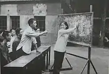 At the beginning of the literacy movement, schools were temporary, teachers were amateur, there was no uniform regulation of teaching materials and various "literacy books" were published in multiple places. Some of these "literacy books" were aimed at workers, others at peasants, and still others at urban housewives. Textbooks vary in content depending on the group they are aimed at. "Literacy textbook" mainly consists of text, new words, after class exercise three parts. Ideological and political education, such as supporting the CCP, loving the motherland, anti-feudalism, and loving one's job and dedication, is also necessary content in the textbook.[17] Various types of literacy competitions were held in the course of learning. The People's Liberation Army (PLA) held in Beijing in August 1952 to celebrate the 25th anniversary of the army, even set up a "literacy race" (write the required characters on the ground to start) and "cultural test" items. Rural literacy competitions are more common; some students write on the walls of their homes, doors, and work tools and compete to be "active" in literacy.[18]