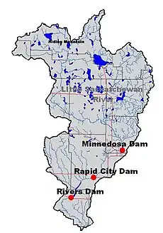 The Little Saskatchewan River is a river in western Manitoba. It originates in Riding Mountain National Park at Lake Audy and flows about 65 miles (105 km) south through the communities of Minnedosa and Rapid City. Its approximate length is 185 km. It joins the Assiniboine River about 6 miles (9.7 km) west of Brandon. The watershed has an area of 1,400 square miles (3,600 km2). The watershed includes numerous lakes and three man made reservoirs (Minnedosa Lake, Rapid City Reservoir and Lake Wahtopanah.