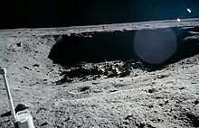 The Apollo 11 astronauts Neil Armstrong and Buzz Aldrin landed the Lunar Module (LM) Eagle approximately 60 meters west of Little West Crater on July 20, 1969. This is the crater Neil Armstrong mentions during his final descent onto the lunar surface. The south-west rim of the crater marks the farthest point that either astronaut traveled from the lunar module during their time on the lunar surface for the Apollo 11 mission.[1] No visit to a crater had been planned during the landing since there was no expectation that the lander would be near a crater of any size.[2] Armstrong observed some rocks at the center of the crater but didn't enter the crater to sample them.[2]