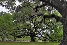 In 2013, the Live Oak Society had 7,114 registered members dating from 1934, but many of the earliest registrants are labeled deceased. The live oak with the largest girth serves as President of the Society.[4] In 1968, Seven Sisters Oak achieved President status and has retained the title with a girth of more than 38 feet (12 meters), as measured in 2008.[5] The largest stand (group) of registered live oaks, consisting of more than 200 trees, is located in City Park (New Orleans).