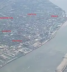 Bramley-Moore Dock, Regent Road, Boundary Street, Luton Street, Northern Line rail track, Chadwick Street, Chisenhale Street, Vauxhall Road, Ford Street, Scotland Road, Byrom Way, Hunter Street, Islington, Salisbury Street, Langsdale Street, Shaw Street, College Street South, Brunswick Road, Low Hill, Hall Lane, Mount Vernon Green, Irvine Street, Mason Street, Grinfield Street, Crown Street, Upper Parliament Street, St James Place, Stanhope Street, Gore Street, Hill Street, Sefton Street, Brunswick Way, Waterfront Perimeter.