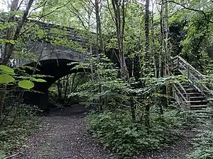 The steps take you beneath the B4401 where the arch of the railway bridge is still accessible. The old line is walkable but overgrown.