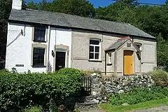 In 1283 Edward I of England forced the monks of Aberconwy Abbey, in Conwy, to relocate to Maenan, to make way for the castle and fortifications he was building in the town.[3] The abbey survived until it was dissolved by Henry VIII in 1538. A house was built on the site, which was replaced in 1852 by what is now the Maenan Abbey Hotel.[4] Drainage work at the hotel in 2011 unearthed remains of the abbey buildings.[5] Nearby Maenan Hall is a 15th-century timber-framed house containing elaborate Elizabethan plasterwork, which is Grade I listed.[6] The house was bought in 1946, and restored, by Henry McLaren, who was responsible for developing Bodnant Garden, as a dower house for his wife Christabel. The garden, which is open to the public a few days each year, was developed by McLaren and, after his death in 1953, his widow and their youngest son, Christopher McLaren.[7] To the east stands Caer Oleu, a prehistoric hillfort.[8]
