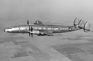 A United States Navy R7V-2 (L-1249) in flight: The L-1249 used Pratt & Whitney T34 turboprop engines in place of the Wright R-3350 radials.[15]