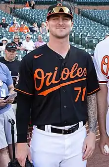 On November 19, 2021, the Orioles selected Gillaspie's contract and added him to their 40-man roster to protect him from the Rule 5 draft.[9] He returned to Bowie to open the 2022 season.[10] After six appearances with Bowie in 2022, he was promoted to the Norfolk Tides of the Triple-A International League.[11] On May 17, 2022, the Orioles promoted Gillaspie to the major leagues for the first time. He made his MLB debut that night versus the New York Yankees at Oriole Park at Camden Yards, throwing two scoreless innings in relief.[12] On October 2, Gillaspie threw a scoreless 6th inning against the New York Yankees at Yankee Stadium to record his first major-league victory in a 3–1 Orioles win.[13] Gillaspie finished the season with a 1–0 record with a 3.12 ERA in 17+1⁄3 innings pitched in 17 appearances.