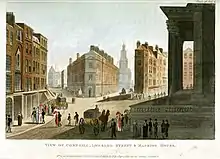 ![]() Lombard Street from Bank junction. The street continues to the left of St Mary Woolnoth church; to the right is King William Street. | |