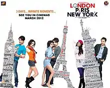 London, Paris, New York also known by the initialism LPNY, is 2012 Indian Hindi-language romantic comedy film written and directed by Anu Menon, with Ali Zafar and Aditi Rao Hydari in the lead roles. The official theatrical trailer was released on 14 January 2012 while the film was released worldwide on 2 March 2012, to positive reviews. Made on a budget of ₹7 crores including promotional costs, the film earned ₹ 240 million.[2] The film earned Rs. 64.3 million in first week in domestic box office and Rs. 90 million lifetime.[3] In overseas too it was a winner and earned Rs. 20 million in first week and Rs. 40 million lifetime.[4]
