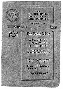 The London Foot Hospital was founded in 1913 as The Pedic Clinic for Gratuitous Treatment of the Feet. It was the first free clinic for treatment of feet in England, and its School of Podiatric Medicine, which started as evening classes in 1919, provided the first systematic education in chiropody.[1][2]