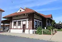 Due to repeated storm damage to rails and other equipment, the LIRR petitioned the New York State Public Service Commission to move the station 1000 feet north in January 1909, which was fully endorsed by the Estates of Long Beach who even offered to exchange land with the railroad.[9] That permission was granted in February of the same year. The present depot at Park Avenue was built in June 1909, and is larger than the previous station off the Atlantic Coast. It was designed by Kenneth M. Murchison, who also designed the 1913-built Jamaica station[10] and Hoboken Terminal. Over a year later, the station and the line were electrified. The station was renovated in 1988. Another renovation in the early 2000s added a parking garage, bus depot, and platform bridge. The bus depot is on Centre Street adjacent to the station building, and the parking garage contains a section for bicycles.