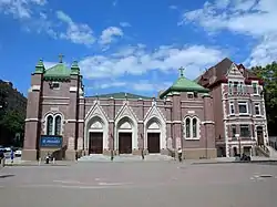 The New York Public Library operates two branches near Longwood. The Woodstock branch, a two-story Carnegie library building opened in 1914, is located at 761 East 160th Street.[38] The Hunts Point branch, a two-story Carnegie library building opened in 1929, is located at 877 Southern Boulevard.[39] The Hunts Point library, designed by Carrère and Hastings in the Italian Renaissance style, was the last Carnegie library built for the New York Public Library system and is a New York City designated landmark.[40]