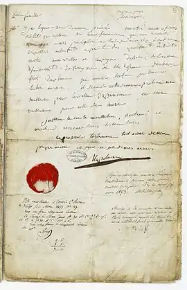 - ↑ "Premier codicille du testament de Napoléon Ier, autographe et signé par l'Empereur, à Longwood le 16 avril 1821" [First codicil of the will of Napoleon I, autograph and signed by the Emperor, at Longwood on April 16, 1821]. Ministry of Culture (in French). Government of France. Retrieved 8 April 2020.