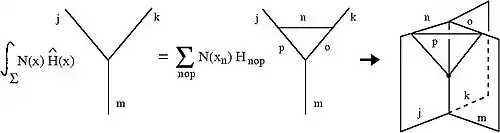 This then naturally gives rise to the two-complex (a combinatorial set of faces that join along edges, which in turn join on vertices) underlying the spin foam description; we evolve forward an initial spin network sweeping out a surface, the action of the Hamiltonian constraint operator is to produce a new planar surface starting at the vertex. We are able to use the action of the Hamiltonian constraint on the vertex of a spin network state to associate an amplitude to each "interaction" (in analogy to Feynman diagrams). See figure below. This opens a way of trying to directly link canonical LQG to a path integral description. Just as a spin networks describe quantum space, each configuration contributing to these path integrals, or sums over history, describe 'quantum space-time'. Because of their resemblance to soap foams and the way they are labeled John Baez gave these 'quantum space-times' the name 'spin foams'.