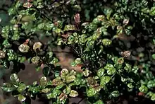 Lophomyrtus obcordataRōhutuGrows to around 8 m tall but is more tree-like in form. It has very small inversely heart-shaped (petiole at the pointed end) leaves and produces clusters of tiny white flowers in summer that are followed by small dark red to purple-red berries. The cultivars 'Dainty' and 'Microphylla' have pink-tinted leaves.It occurs throughout New Zealand except for much of Southland.