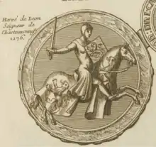 • Harvey IV: his son, married c. 1260 Matilda of Poissy, Lady of Noyon-sur-Andelle, Radepont, Hacqueville, Acquigny, died c. 1290 and was buried in the Abbey of Fontaine-Guérard.[2] In September 1281 he exchanged all his estated in Châteauneuf and Senonches with King Philip III the Bold. This part of the inheritance went to Louis of Valois, Count of Chartres, who had obtained the estate of Châteauneuf-en-Thymerais. When King Philip VI died childless in 1329, he gave his brother Charles II of Valois, Count of Alençon and Perche, a part of their brother's inheritance, and gave him in a charter dated May 1335 the lands of Châteauneuf-en-Thimerais, Senonches and Champrond among others.