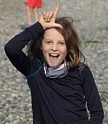 The Loser is a hand gesture made by extending the right thumb and index fingers, leaving the other fingers closed to create the letter L, interpreted as "loser", and generally given as a demeaning sign.[1] Sometimes this is accompanied by raising the hand to the giver's forehead.[1]