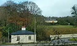 ![]() Gate lodge, entrance and main building (right rear-ground) of Lotamore House | |