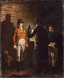 The military commission, presided over by Hulin, drew up the act of condemnation, being incited thereto by orders from Anne Jean Marie René Savary, who had come charged with instructions to kill the duke. Savary prevented any chance of an interview between the condemned and the First Consul, and, on 21 March, the duke was shot in the moat of the castle, near a grave which had already been prepared. A platoon of the Gendarmes d'élite was in charge of the execution.[4] His last words were "I must die then at the hands of Frenchmen!"[5]