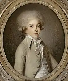 The Duke of Enghien was the only son of Louis Henri de Bourbon and Bathilde d'Orléans.[1] As a member of the reigning House of Bourbon, he was a prince du sang. He was born at the Château de Chantilly, the country residence of the Princes of Condé – a title he was born to inherit. He was given the title duc d'Enghien from birth, his father already being the Duke of Bourbon and the heir of the Prince of Condé, the Duke of Bourbon being the Heir apparent of Condé.