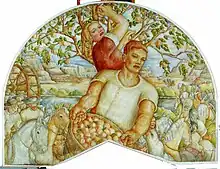 Emerson's second Section mural commission was designed for the post office in Grand Junction, Colorado.[19] The Harvest (7'x 9' oil on crescent shaped canvas) was installed in the joint post office and courthouse in 1940. The Harvest depicts a young man and woman working together harvesting peaches, with a water wheel in the background, symbolizing "the richness that came to the land following the introduction of irrigation".[20]