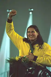Sauvage is often regarded as the most renowned disabled sportswoman in Australia.[3][4] She won nine gold and four silver medals at four Paralympic Games and eleven gold and two silver medals at three IPC Athletics World Championships. She has won four Boston Marathons, and held world records in the 1500 m, 5000 m and 4x100 m and 4x400 m relays. She was Australian Female Athlete of the Year in 1999, and International Female Wheelchair Athlete of the Year in 1999 and 2000. In 2002, her autobiography Louise Sauvage: My Story was published.