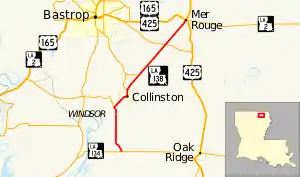 A largely rural route, LA 138 connects the small villages of Collinston and Mer Rouge, located northeast of Monroe. Its southern terminus (LA 134) leads to Monroe in neighboring Ouachita Parish, as well as the village of Oak Ridge in southern Morehouse Parish. The northern terminus is located at the east end of the concurrency of US 165 and US 425. The two highways split toward Monroe and the Arkansas state line, respectively, after heading west into Bastrop, the parish seat.
