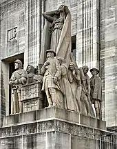 The front doors to the Capitol are reached by a "monumental stairway" consisting of 49, Minnesota granite steps.[42] Each step has engraved the name of a U.S. state in the order of its statehood; Alaska and Hawaii, which were admitted after the completion of the Capitol, are both on the last step along with the phrase "E pluribus unum".[42] Flanking both sides of the stairs are free-standing, limestone sculptures by Lorado Taft entitled Pioneers and Patriots, respectively, memorializing both the early settlers and defenders of Louisiana.[42] On either side of the front doors are reliefs designed by Adolph Alexander Weinman depicting allegorical scenes of government providing "protection and encouragement...to the welfare of its people."[43] Contrasting with Weinmans's reliefs is Lee Lawrie's flatter architrave that frames the doors and portal; the architrave more closely resembles the style of ancient Egyptian reliefs.[44]