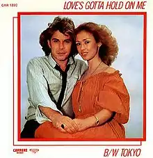 "Love's Gotta Hold on Me" was backed by another Van Day/Bazar composition "Tokyo" as its B-side. This song was also released as a single in Japan the following year.[7] The UK single was released in standard 7-inch vinyl as well as an alternate version on clear vinyl with a picture sleeve.[8] Both tracks were featured on Dollar's debut album Shooting Stars, which was released soon after the single. The album itself peaked at No.36 in the UK albums Chart.[1] Dollar released just one more single with Carrere Records before departing to WEA in 1980. "Love's Gotta Hold on Me" was the first of five top ten hits for the duo, but was the only one they composed.
