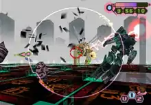 Love & Destroy is a third-person shooter consisting of a series of missions where the player uses a Battle Pod mech to eliminate either a single, large boss or a group of smaller enemies.[1] These battles have a five-minute time limit and take place in large, 3D cityscapes through which the player can freely maneuver. The environments are highly destructible, allowing the player to demolish any building.[2] The game supports DualShock controller functionality with the analog sticks mapped to movement and aiming.[3] The player can choose one of three mechs and its respective Q-Tron navigator for any mission. All of them come equipped with a basic vulcan cannon for targeting and firing at enemies from a distance, though each Battle Pod varies in speed and has a unique set of weapons. ViVi's "V-Silhouette" is the fastest but uses mostly weak, short-ranged melee attacks; LuLu's "L-Silhouette" is the slowest but uses mostly powerful, long-ranged projectiles; and KiKi's "K-Silhouette" has balanced speed and uses medium-ranged lasers that deal intermediate damage.[4] One Battle Pod may present more of an advantage over another depending on the situation. Performing well increases the player's score and unlocks more powerful upgrades.[1] If the player's health gauge depletes, the mission is a failure though it will not result in a game over. The storyline will progress regardless of whether a player accomplishes or fails a mission.