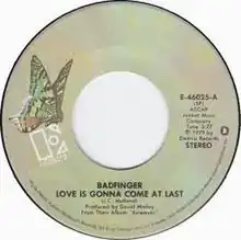 "Love Is Gonna Come at Last" was first released on Airwaves, Badfinger's first album since original guitarist Pete Ham committed suicide in 1975. Despite its billing as Badfinger's "comeback album," it failed to make much of an impression on listeners, only hitting No. 125 in America. However, despite the failure of the album and its lead single, "Lost Inside Your Love," "Love Is Gonna Come at Last" was released as a single in 1979. Backed with the Tom Evans-penned "Sail Away" (also from Airwaves), the single was the only one from Airwaves to chart, reaching No. 69 on the Billboard Hot 100 in the United States.[2] The single would prove to be the final Badfinger single to be released in Britain, and the penultimate one to chart (the final being "Hold On".)