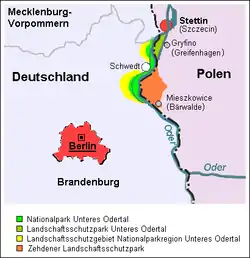 · Yellow: Landscape Conservation Area Lower Oder Valley National Park Region – German non-core area
