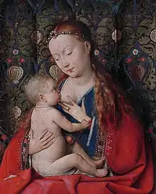 The Lucca Madonna is an oil painting by the Early Netherlandish master Jan van Eyck, painted in approximately 1437.[1] It shows Mary seated on a wooden throne and crowned by a canopy, breastfeeding the infant Christ.[2] Its carpentry suggests it was once the inner panel of a triptych, while its small size indicates it was meant for private devotion. The painting is in the collection of the Städel Museum, Frankfurt.