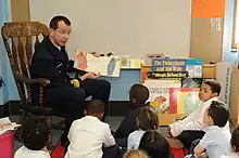 Rear Admiral J. Scott Burhoe reads Three Wishes, a children's book by Lucille Clifton, to a first-grade class at Nathan Hale Elementary in honor of African American History Month.