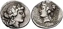 Coin minted in 78 BC by Lucius Cassius, son of Quintus (L CASSI Q F), depicting Libera (left) and Bacchus (right)
