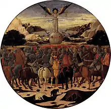 Lucrezia was a significant patron of the arts. She commissioned the Morgante by Luigi Pulci, who called her "a famous lady in our century",[37] and supported many poets, including Bernardo Bellincioni and Angelo Poliziano,[38] who later became a tutor to her grandchildren by Lorenzo.[39] Similarly, religious institutions relied on Lucrezia's patronage.[40] She was responsible for the addition of the Chapel of the Visitation in the Basilica of San Lorenzo in Florence[41] and noted for donating many votive statues of her family to numerous churches.[40] She was known to be devoted to John the Baptist, patron saint of Florence.[42] After she became ill in 1467, she believed her recovery was due to the intercession of Saint Romuald and supported the hermitage that he had founded at Camaldoli from then on.[40]