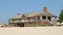 The Ludington State Park Beach House is a two-story square plan building measuring 116 feet (35 m) by 35 feet (11 m).[2] It sits on a concrete foundation, and has red brick walls on the lower story, wooden singles on the upper story, and a cedar shingle hip roof.[3] Three brick archways on the lower floor provide access from the beach house directly to the Lake Michigan beach.