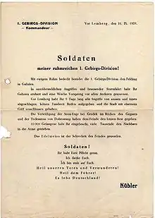 At the start of World War II, Kübler's division was involved in the invasion of Poland as part of the 14th Army, commencing on 1 September 1939. It fought in the Carpathian Mountains, distinguishing itself during the capture of the Dukla Pass.[5] On 27 October, Kübler was awarded the Knight's Cross of the Iron Cross for his role in the Polish campaign.[6] Then on 1 December 1939 he was promoted to Generalleutnant.[1] During the invasion of France and the Low Countries in May 1940, Kübler's division was not heavily committed, fighting on the Franco-Belgian border and crossing the Maas on 15 May. The division was stationed around Arras after the fall of France, as it had been selected to form part of the invasion force for Operation Sealion, the invasion of the United Kingdom. After that operation was postponed, on 25 October 1940 Kübler was appointed to command the XXXXIX Mountain Corps,[1] which included the 1st Mountain Division. His corps was earmarked for Operation Felix, the planned capture of Gibraltar, but that operation was also called off.[5] Due to the disfigurement caused by the wounds he suffered during World War I, Kübler became known to his troops as "Limping Nurmi", a reference to the Finnish long-distance runner Paavo Nurmi.[7]